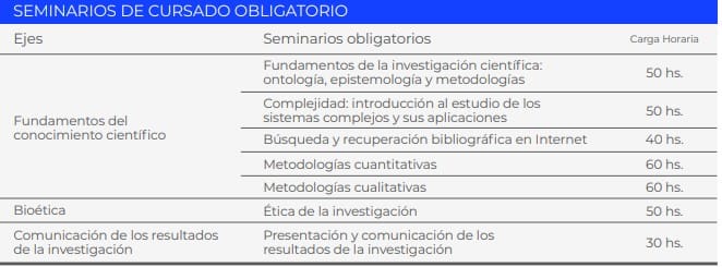 A– Ciclo de formación: tiene una duración 440 horas durante 24 meses (seis semanas presenciales intensivas). Se distribuyen en 340 horas de cursado obligatorio y, al menos, 100 horas de cursado electivo de acuerdo al tema del proyecto de tesis. Está organizado en base a tres ejes: