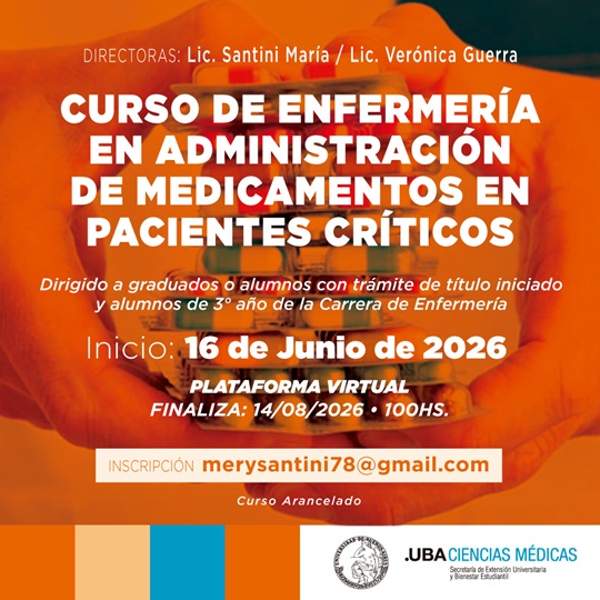 Enfermería en Administración de Medicamentos en Pacientes Críticos 2026 es un Curso Extracurricular de la Secretaría de Extensión Universitaria y Bienestar Estudiantil (seube) Ciencias Médicas. UBA