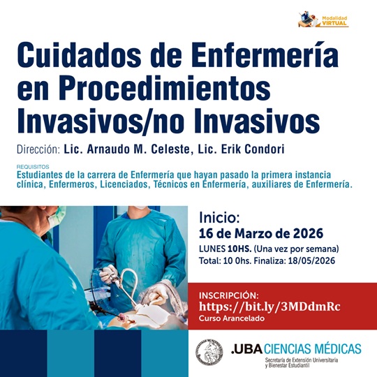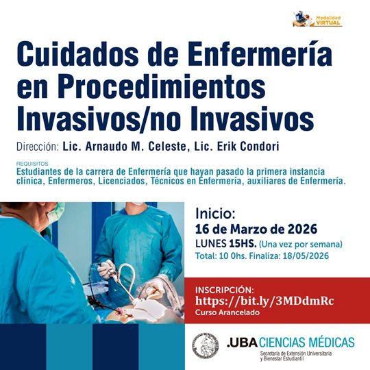La Secretaría de Extensión Universitaria y Bienestar Estudiantil (seube) Ciencias Médicas – UBA organiza el Curso Extracurricular de Cuidados de Enfermería en Procedimientos Invasivos/ no Invasivos.