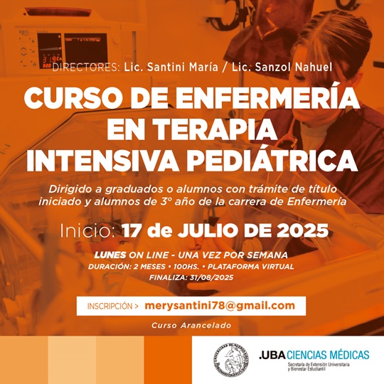 La Secretaría de Extensión Universitaria y Bienestar Estudiantil (seube) Ciencias Médicas. UBA organiza el Curso Extracurricular de Enfermería en Terapia Intensiva Pediátrica. Comienza: 17 de julio de 2025. Finaliza: 31 de agosto de 2025. Modalidad Virtual. Días lunes una vez por semana.