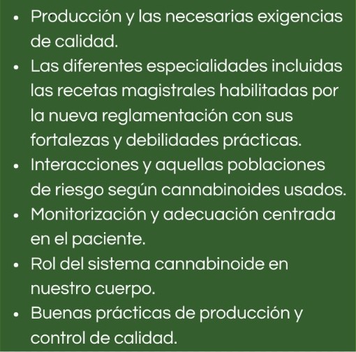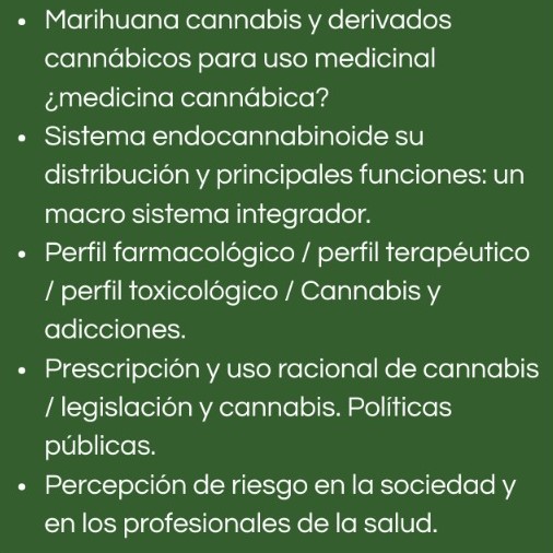 Se abordarán diferentes temas con vistas a conocer y profundizar aspectos de la farmacología terapéutica y toxicología del uso de derivados cannabinoides en medicina.