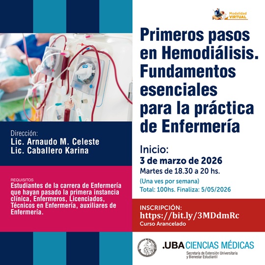 La Secretaría de Extensión Universitaria y Bienestar Estudiantil (seube) Ciencias Médicas – UBA organiza el Curso Extracurricular de Primeros pasos en Hemodiálisis. Fundamentos esenciales para la práctica de Enfermería.