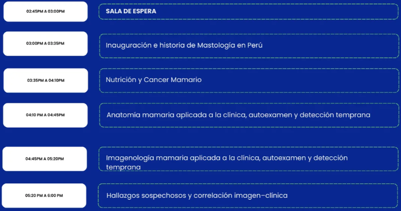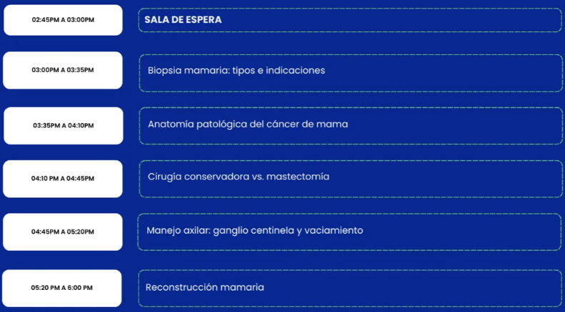 Evento académico diseñado para fortalecer las competencias del primer nivel de atención en el abordaje de la patología mamaria, con contenidos prácticos, actualizados y basados en evidencia científica.