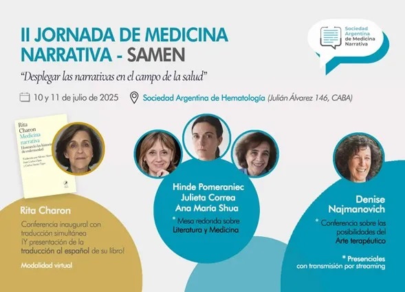 La II Jornada de la Sociedad Argentina de Medicina Narrativa (SAMEN)“Desplegar las narrativas en el campo de la salud” se realizarán el 10 y 11 de julio de 2025. Modalidad mixta: virtual (10/7) y presencial y virtual (11/7). Sede: Sociedad Argentina de Hematología. Julián Álvarez 146, Ciudad Autónoma de Buenos Aires. Argentina.