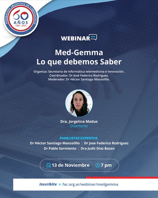La Secretaría de Informática, Telemedicina e Innovación de la Federación Argentina de Cardiología organiza el Webinar Med-Gemma: Lo que debemos saber.