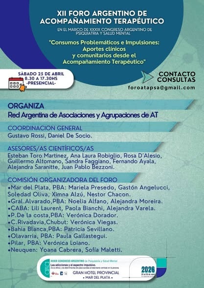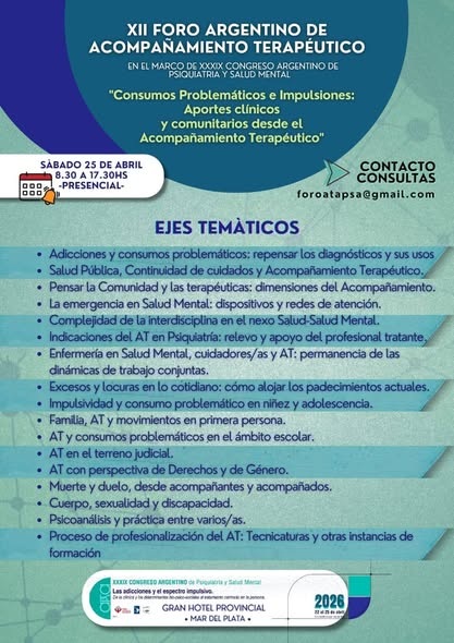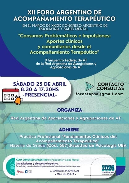 La Red Argentina de Asociaciones y Agrupaciones de Acompañantes Terapéuticos invita a participar del XII Foro Argentino de Acompañamiento Terapéutico y del X Encuentro Federal de AT en el marco del XXXIX Congreso Argentino de Psiquiatría y Salud Mental de APSA2026